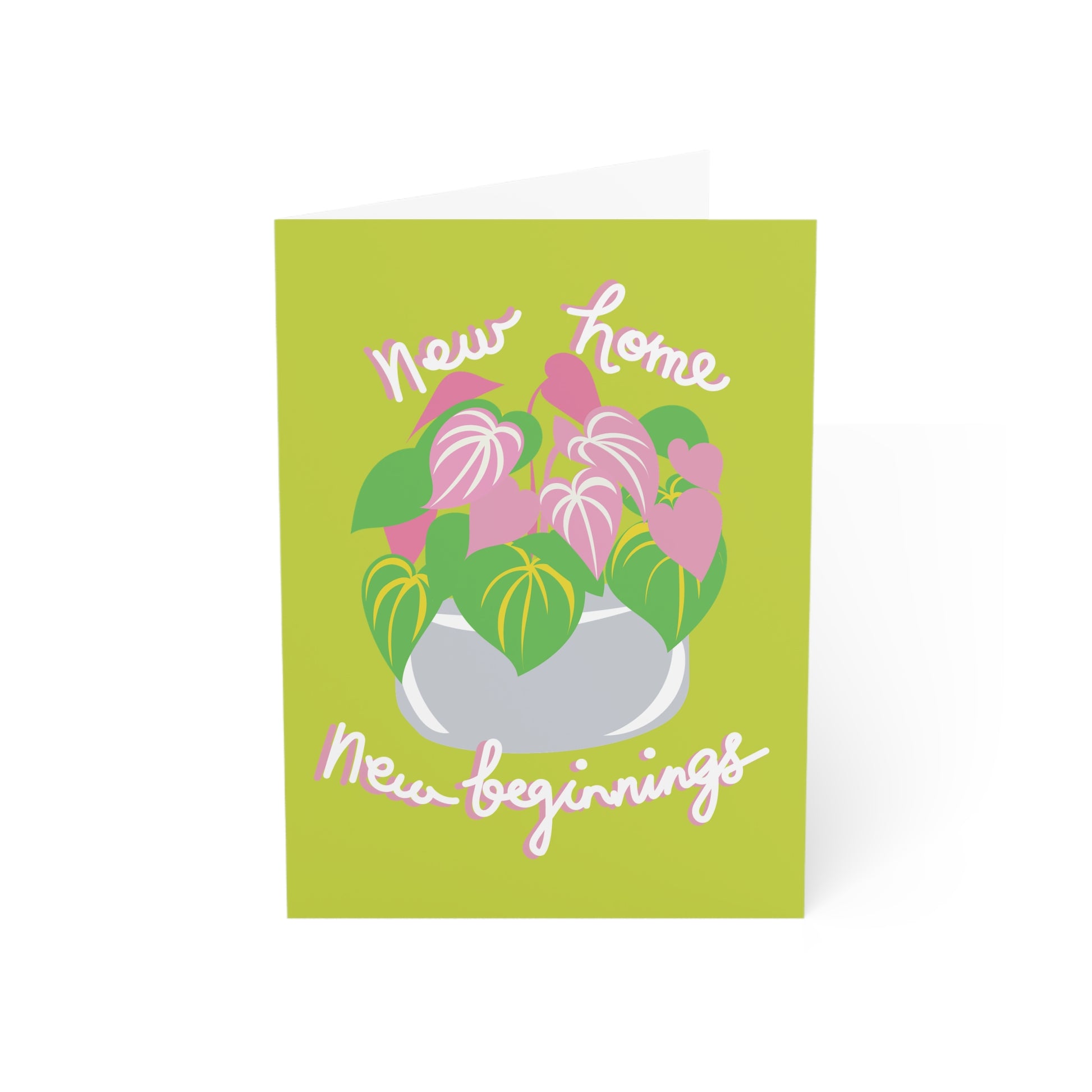 Welcome Home Greeting Cards - New Home New Beginnings greeting card featuring Pink Princess Philodendron design. Perfect for sending warm wishes to friends and family members who are moving into a new home. Ideal for housewarming parties and celebrations.