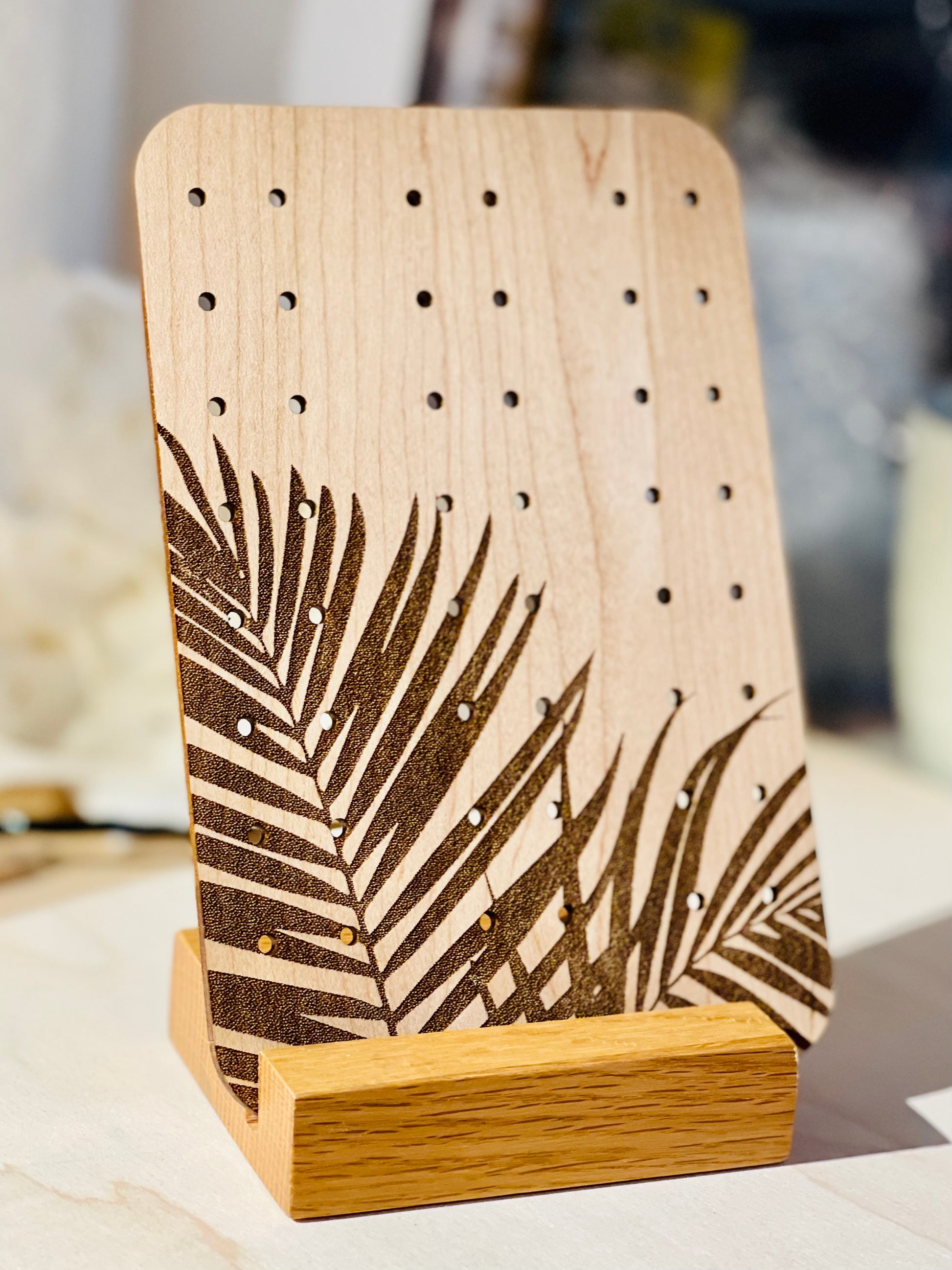 Show off your earring collection in a tropical fashion! The Tropical Earring Organizer is a great way to keep all of your earrings organized in a compact and travel-friendly size. Keep it flat and secure in a cabinet drawer or displayed on a wood block stand.